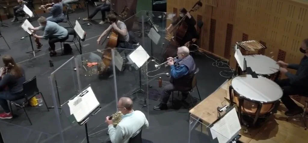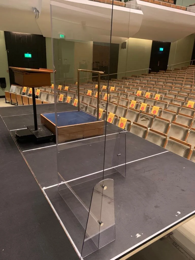 Below is an example of how our Protection Screens can be used in a professional setting to protect the musicians and crew while adhering to COVID 19 protocol